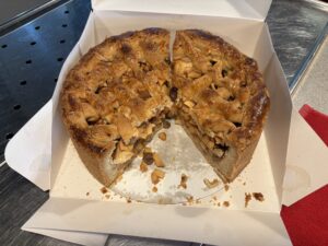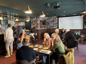 Diverse dorpsgenoten waren gekomen voor een versnapering en een stuk heerlijke appeltaart, gemaakt door de bewoners van Leekerweide. Een aantal genoot daarna ook nog van een broodje kroket of tosti. Sommigen namen zelfs een tweede! Ondertussen knapte het buiten wat op en kwam zelfs de zon tevoorschijn. Nog niet warm genoeg voor een terras maar dat mocht de pret niet drukken. Er komen nog genoeg kansen daarvoor.