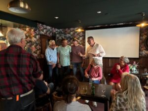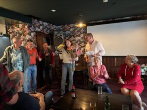 Aangezien er elke drie jaar een nieuw bestuur aantreedt, was het nu tijd voor afscheid van het vorige bestuur. Zij werden bedankt voor hun inzet van de afgelopen jaren. Ruud Schilder, Gilian Gillissen en Gert Jan Moens ontvingen ook een mooie bos, een fles wijn en uiteraard applaus. Zij hebben het Dorpshuis en de hele beleving nieuw leven ingeblazen. Met veel succes zijn er activiteiten bijgekomen, is het Dorpshuis compleet gerenoveerd (met name op gebied van duurzaamheid) en zijn er nog meer vrijwilligers bijgekomen. Het huidige bestuur bestaat uit Jan-Willem Sepers (secretaris), Henk de Geus (penningmeester) en Alwin Rootlieb (voorzitter).